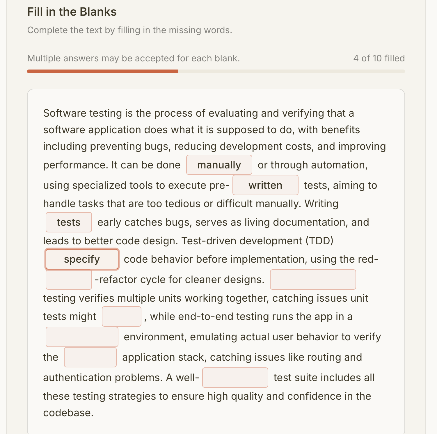 Take our fill-in-the-blank exercises. A learner reads a passage with certain words removed, then types the missing terms into input fields. Here's what the experience looks like: