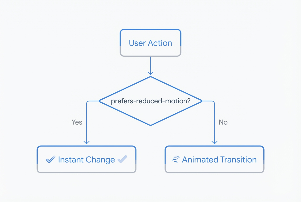 A good example is our theme toggle. Switching between light and dark mode normally plays a smooth crossfade. But if you prefer reduced motion, the theme just switches. No animation, no transition. Your preference, respected quietly.