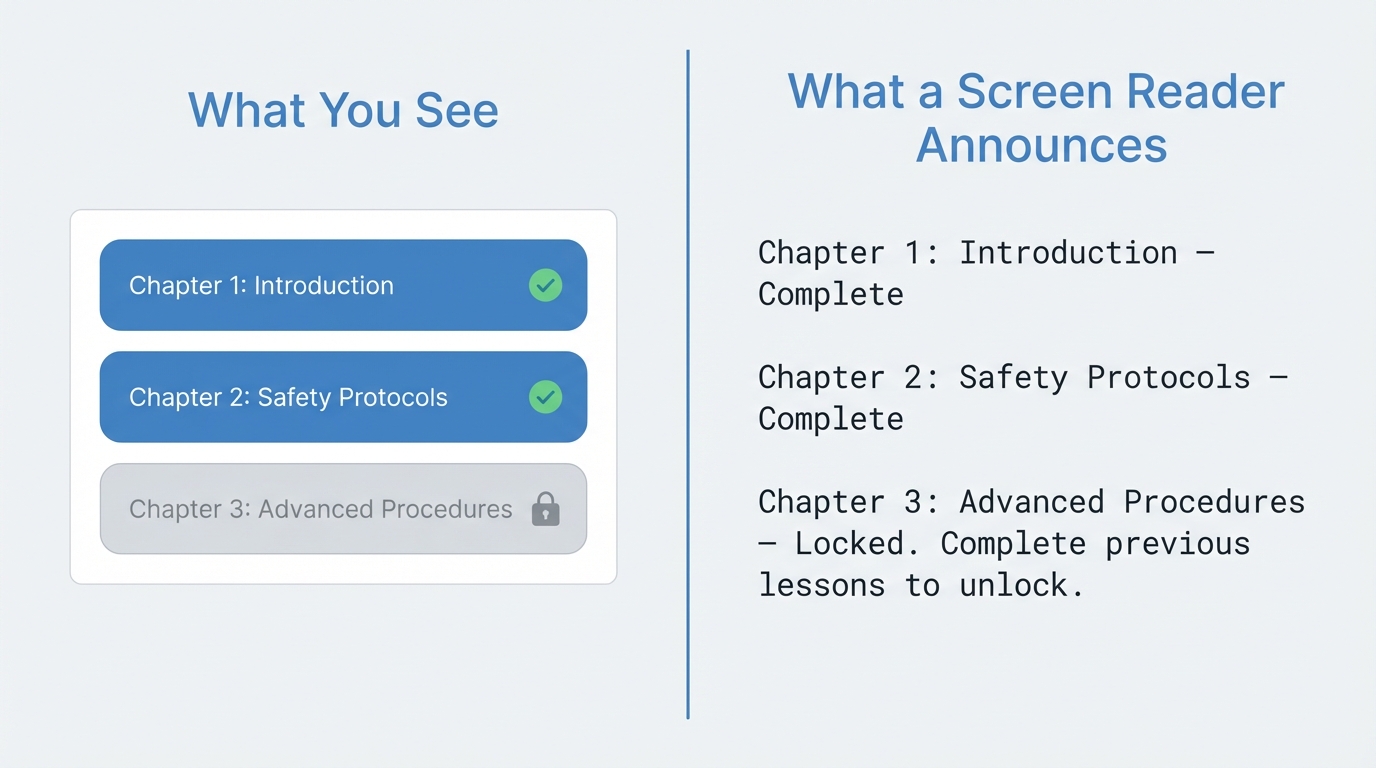 In iTELL, learners progress through content sequentially. You need to complete one section before the next one unlocks. Sighted users see a lock icon. Screen reader users hear: "Locked. Complete previous lessons to unlock." Same information, different channel.
